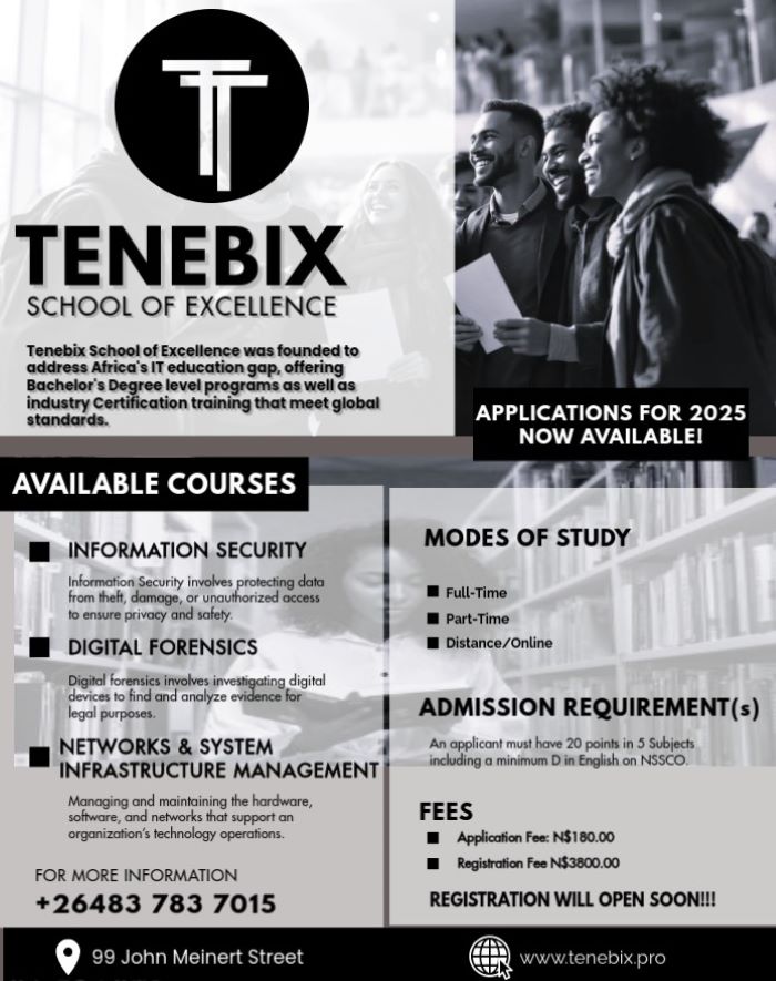 Applications for 2025 now available. For more information call: +264837837015. Visit their office at:99 John Meinert Street, Windhoek West in Windhoek, Namibia. Alternatively visit their website: www.tenebbix.pro