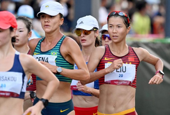 Liu Hong (1st R) of China competes during the women’s 20km race walk final at the Tokyo 2020 Olympic Games in Sapporo, Japan, Aug. 6, 2021. (Xinhua/Guo Chen)