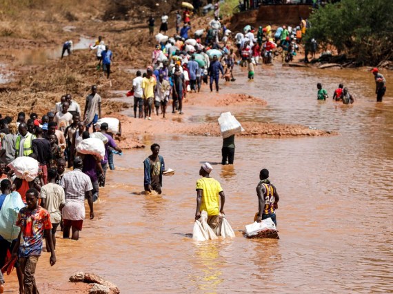 People wade through a flood-destroyed section at the Bangali-Garissa Road in Tana River County, Kenya on Dec. 1, 2023.