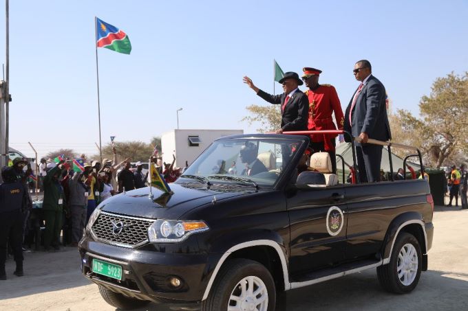 Omuthiya, Aug 26 – President Dr. Nangolo Mbumba this morning arrives at Omuthiya Recreational Park to deliver keynote Address during the 34th Heroes’ Day Commemoration to honour the Heroes and Heroines who fought for Namibia’s Independence.