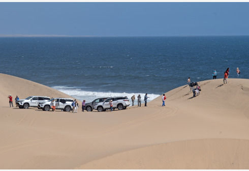 WINDHOEK, March 25, 2024 — Tourists visit the Sandwich Harbor at Namib-Naukluft National Park in Namibia, on March 24, 2024. In Namibia’s Namib-Naukluft National Park, located 400 kilometers from the capital city of Windhoek, there is a scenic spot known as Sandwich Harbor. With its unique half sea and half desert scenery, it attracts tourists from around the world.