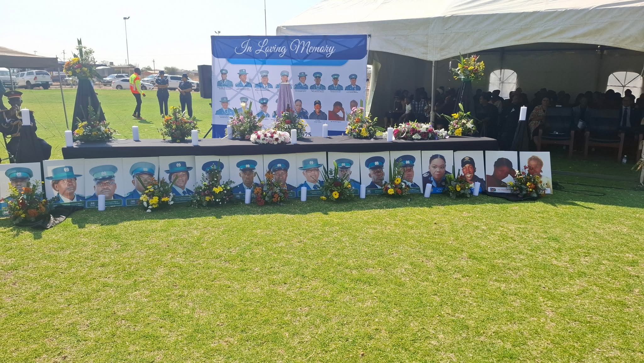 A solemn atmosphere engulfed Mariental Sport Stadium as families, colleagues, and the nation came together for the mass memorial service honoring 16 individuals, including Nampol officers, Namibia Correctional Service officers, and two civilians who tragically lost their lives in a recent accident between Mariental and Kalkrand. The community awaited the arrival of the Head of State, who was expected to pay tribute to the fallen heroes. The memorial service, held to recognize the national tragedy and the preciousness of every life lost, was a poignant moment of collective mourning and reflection on the sacrifices made by those who served the country.