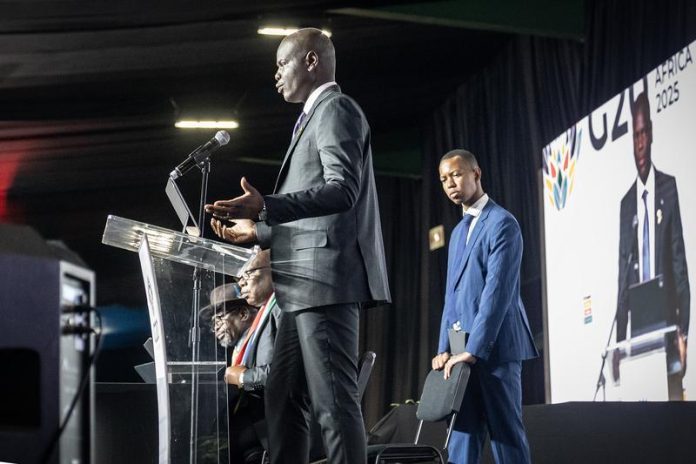 JOHANNESBURG, Nov.20 — South African International Relations and Cooperation Minister Ronald Lamola (2nd R) speaks during a press conference on preparations ahead of Saturday’s Group of 20 (G20) Leaders’ Summit in Johannesburg, South Africa, Nov. 17, 2025.